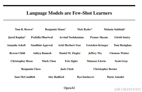 GPT-3论文包含31个作者,整整72页论文,足可以说明工作量之大,全力演绎了“暴力出奇迹”,在一些NLP任务的数据集中使用少量样本的Few-shot方式甚至达到了最好效果,省去了模型微调,也省去了人工标注的成本。下图看看GPT-3论文庞大的作者阵容: