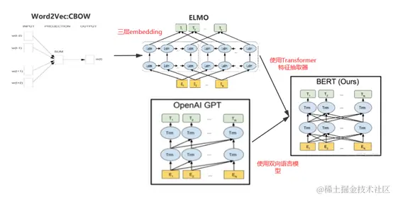 图1 Word2vec、ELMO、GPT和BERT之间的关系图