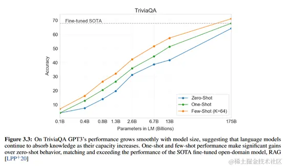 下面是GPT-3模型在TriviaQA数据集上的实验结果图: