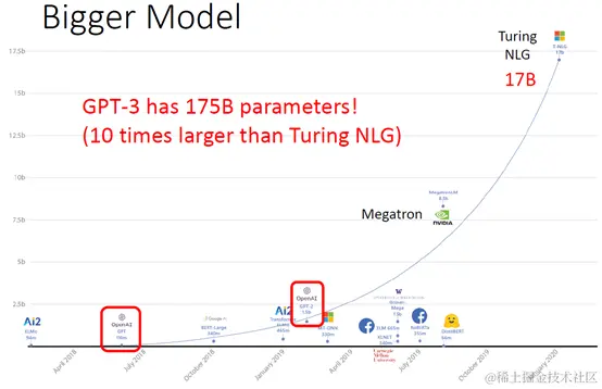 最近一段时间GPT-3强力出击,直接引爆NLP领域。如果说GPT-2模型已经足够大了,那么GPT-3已经可以说是爆炸了。先从参数角度看看GPT-3到底有多大。最早的ELMO模型有94M,然后2018年7月GPT出世,模型参数有110M,接着BERT-Large有340M;后来GPT-2出世已经把参数弄到1.5b了;再后来随着Turing NLG的出现直接将参数提升到17b,成为当时最大的模型;最后GPT-3出现了,直接将参数增加到175b,参数量基本上是第二名Turing NLG的十倍。通过这些现象咱们可以看出把模型做大似乎已经成为NLP领域的趋势。有时候费尽心思开发和优化模型,各种花里胡哨的骚操作下来结果发现最后的效果还不如最简单的用更大的模型更多的数据来的有效,这也是为啥那么多人不断去优化预训练模型的原因。下面是NLP领域各种模型参数量对比图: