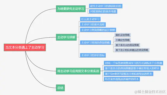 本篇主要讲解将主动学习应用到文本分类任务。首先讲了下为啥要研究主动学习。因为标注样本是有成本的,所以我们要尽量用更少的标注样本来得到一个效果更好的模型,这是研究主动学习的原因和目的;然后详解主动学习,主要包括主动学习的定义、基本流程、查询策略的设计原则、常用的查询策略以及主动学习的评价指标;最后讲了下将主动学习应用到文本分类实战的详细步骤,从使用不同的BERT预训练模型获取多个分类器到基于委员会的查询策略获取不确定性较大的样本,再到基于SimBERT获取语义相似度较远的样本,再到结合业务视角选择最终的样本。对于希望将主动学习应用到实际的机器学习项目的小伙伴可能会有帮助。
