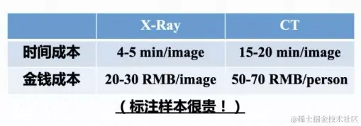 经过上面的例子,咱们引出研究主动学习的原因和目的:标注样本是有成本的,我们要尽量选出那些能提升模型能力的样本。 下面是医学领域中标注X射线图像和CT图像的标注时间成本和金钱成本图:\