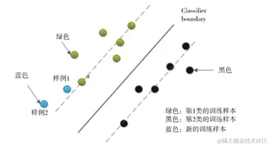 上图中是一个二分类任务。其中绿色代表第一类样本,黑色代表第二类样本。现在我们使用模型去预测未标注样本获得样例1和样例2,图中通过蓝色表示。对于模型来说加入样例2比加入样例1对模型的贡献度会更大,因为样例1附近已经有相似的样本,所以从样本差异性更大的角度来说选择样例2会更加合适。