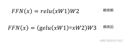 总体来说MT5使用的是T5的最新方案,也就是使用Gated Linear Unit(GLU)来增加前馈神经网络FFN的效果。下面是修改前后的FFN: