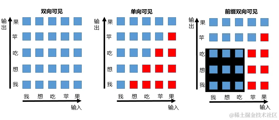 从上图中我们输入“我想吃苹果”这句话,看看三种不同的注意力机制掩码操作是如何运转的:第一种双向可见的机制比较简单,每个字符不管顺序都可以看到全体;第二种单向可见的机制是考虑顺序的,每个字符只能看到当前以及之前的部分,比如对于字符“吃”来说只能看到“吃”以及之前的字符“我”和“想”;最麻烦的是第三种前缀双向可见的机制,这种机制是部分考虑顺序的。对于前缀“我想吃”来说每个字符是双向可见的,但是对于后面的字符“苹果”来说是单向的。比如前缀中(上图中最右边部分黑色方框内属于前缀范围)的字符“想”可以同时看到“我想吃”,但是前缀之后的字符“苹”却看不到之后的“果”。