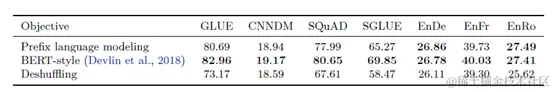 通过实验的方式发现使用类BERT方式的效果最好,所以T5模型确定使用类BERT方式的随机掩码的预训练方式。下面是三种自监督的预训练方式实验对比图: