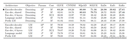 通过实验发现Encoder-decoder架构的模型效果最好,所以T5模型本质上来说是一个基于Transformer的Encoder-decoder模型。下面是实验对比数据: