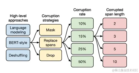 上面已经确定了使用类BERT方式破坏掉部分内容,主流的文本破坏方式有以下三种:假如现在有一句话“我喜欢吃苹果,还喜欢跑步”。第一种是原生BERT使用的是随机掩码的操作,也就是随机选择一部分比例来进行掩码,主要是单字,经过第一种文本破坏方式可能得到“我喜欢吃苹【Mask】,还喜欢【Mask】步”;第二种随机小段替换的方式Replace spans。这里随机小段的替换方式会把相邻内容进行替换,可能更多会考虑一个完整的词,比如经过第二种文本破坏方式可能得到“我喜欢吃【Mask】,还喜欢【Mask】”。相比于第一种将苹和跑两个单字掩码掉,第二种会将完整的词苹果和跑步都进行掩码操作;第三种方式是drop法,直接将部分内容删除掉。\