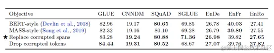 通过实验发现第二种随机小段替换的方式效果最好。之前SpanBERT和基于全词掩码的BERT-WWM也采用的是这种方式。下面是三种文本破坏方式实验对比图: