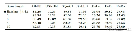 确定好文本破坏比例的选择之后需要确定小段替换的长度。T5模型主要对比了2、3、5、10这四个值,最终发现替换的长度为3的效果是最好的。下面是四种替换长度的选择实验对比图: