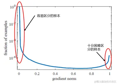 公式4中p代表模型预测为1的概率值,p*是标签值。也就是说如果样本越难区分,那么g的值就越大。下面看看梯度模长g和样本数量的关系图: