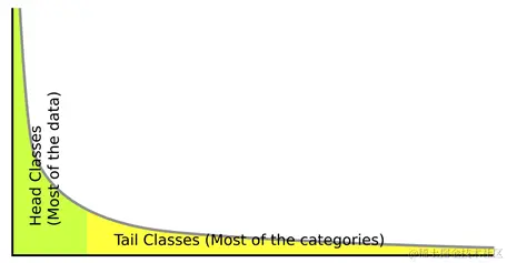 同样的例子会出现在文本分类任务中,假如我们要做一个识别是否对传奇游戏标签感兴趣的文本二分类器,用户搜索中这部分的比例非常少,也许1W条用户搜索query中只有50条甚至更少的样本属于正例。这种现象就是样本不均衡,因为样本会呈现一个长尾分布,头部的标签包含了大量的样本,而尾部的标签拥有很少的样本,就像下面这张图片中表现的那样出现一个长长的尾巴,所以这种现场也称为长尾现象。