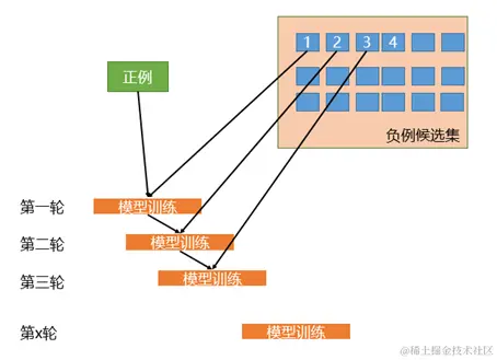 相比于简单的对负样本随机采样的欠采样方法,实际工作中我们会使用迭代预分类的方式来采样负样本。具体流程如下图所示: