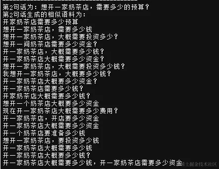 上图中我们输入的初始文本是“想开一家奶茶店,需要多少的预算?”,然后下面就是自动生成的相似的文本。可以发现生成的结果还不赖,整体语义一致,而文本的形式会有些许不同,从而达到了样本增强的目的。这块使用的也是苏剑林的bert4keras中的例子,感兴趣的小伙伴可以去试试: