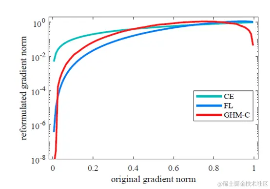 下面看看交叉熵损失函数、Focal Loss和GHM Loss三种损失函数对不同梯度模长样本的抑制效果图: