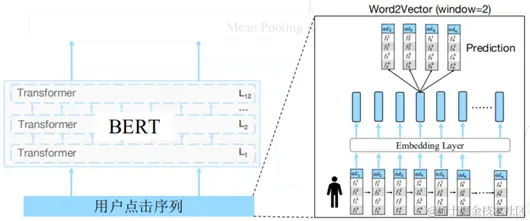预训练阶段一是使用Word2vec模型去训练广告的embedding,具体做法是将用户点击广告的序列输入到Embedding Layer层去预测广告id,这里使用的窗口是2,所以其实是用一个广告去预测另一个广告的embedding,主要目标是将类似的广告进行聚类。这里需要说明的是使用Word2vec模型预训练的目的主要是解决输入端词表过大导致模型难以收敛的问题。因为词表过大会导致词表很难存放到显存,就算把词表放到显存里模型也很难收敛。使用Word2vec预训练图如下所示:\