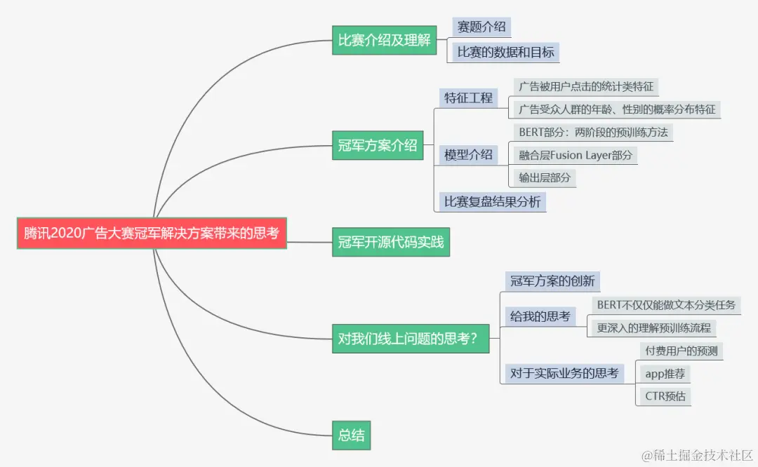 本篇从理论到实践学习了腾讯2020广告大赛冠军鱼佬团队提供的解决方案。首先是比赛介绍及理解;然后重点介绍了冠军方案,主要包括特征工程、模型介绍以及比赛复盘结果分析;接着实践了冠军开源的代码;最后重点思考了冠军方案对我们线上业务有什么帮助,主要包括冠军方案的创新、给我的思考以及对实际业务的思考,认为可以将该方案应用到我们付费用户的预测、app推荐场景以及CTR预估场景。对于希望将BERT应用到广告领域的小伙伴们可能有所帮助。