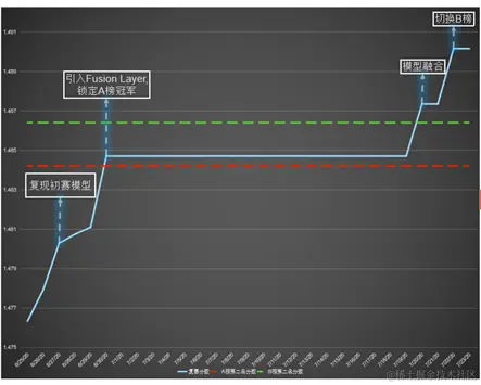 复赛阶段直接复现初赛模型并且引入融合层之后也已经锁定A榜冠军。这里引入融合层对模型的得分提升还是非常明显的,可以看出这个策略还是很不错的。最后再次进行模型融合提升得分夺得冠军。