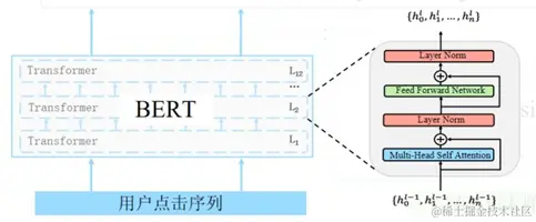可以说BERT部分是本项目最重要的创新点,也是对我影响最大的部分。BERT是自然语言处理领域的一颗明星,我之前也写过很多关于BERT以及BERT应用在文本分类的文章。可以说在这个方案出现之前我一直傻傻的以为BERT就只能应用到自言语言处理领域呀。然后当我看到鱼佬团队将BERT应用到用户性别和年龄预测之后,感觉对BERT的理解又更深了一层。用户点击广告序列和文本很类似,都是序列类的信息,那么这一类的序列信息其实也都可以用自然语言处理领域中的方法去处理,比如BERT。之前是根据一句文本来进行分类,那么现在这句文本变成了一条用户点击广告的序列,每个字变成了某个广告而已,其他都是通用的。将BERT作为编码器进行编码,然后使用12层的Transformer得到交互更高的隐变量。下图是用户点击广告序列经过BERT部分:\