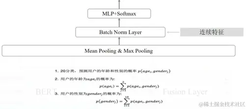 经过BERT部分和融合层部分之后就是最后的输出层。输出层会先经过Max Pooling和Mean pooing后进行拼接,然后会经过Batch Norm层,最后会用一个全连接层进行分类,因为性别有两类,年龄分成10类,总共就是20个分类。输出层如下图所示:\