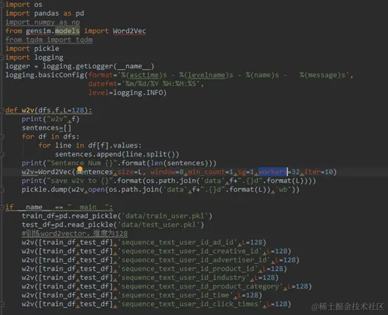 使用Word2vec模型进行预训练非常简单,直接执行如下命令:python src/w2v.py。源码也非常简单,这里有点疑问的是PPT中使用的窗口window是2,但是源码中的window是8。这里小伙伴们需要注意下,下面是Word2vec预训练源码: