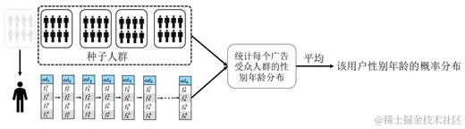 根据上图所示,作者将人群随机划分为五组,假如用户A来自第一组,点击了广告1、广告3、广告4和广告5,那么我们会将其他四组的人群作为种子人群并统计对应的广告1、广告3、广告4和广告5在性别和年龄上的概率分布。通过这种方式每个组里所有的广告都通过其他四组来求出,如果两个组之间有重合的广告还可以相互验证。通过这种方式咱们可以拿到广告维度下每个广告受众人群的性别和年龄分布了。拿到每个广告受众人群的性别和年龄分布之后,然后从用户的维度根据用户点击广告的序列就可以拿到用户的性别和年龄分布了。\