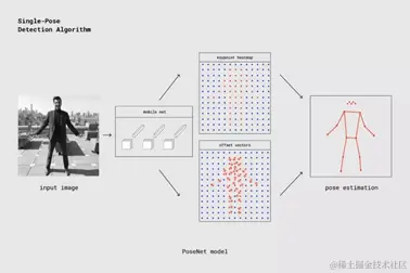 人体姿势识别流程整体分成两步,第一步是将图片作为特征输入到CNN卷积神经网络中;第二步就是利用单姿势或多姿势解码算法输出姿势、姿势置信度得分、关键点位置以及关键点置信度得分。下面是PoseNet模型的姿势检测流程: