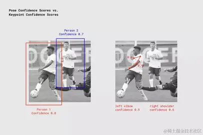 然后再看看关键点位置以及各个关键点的置信度得分。上图中右边部分显示了person1的两个关键点位置以及对应的关键点置信度得分。关键点位置主要通过二维坐标来显示,分别显示了左肘(left elbow)和右肩(right shoulder)。其中左肘的置信度得分是0.9,说明模型认为是左肘的可信度很高,而右肩的置信度得分是0.6,模型认为是右肩的可信度则没那么高了。