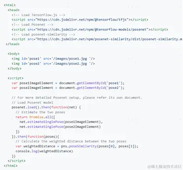 先介绍下这两个开源项目。开源项目1就是TensorFlow的PoseNet模型,通过这个模型苏输入一张图片就会返回图片中人的姿势、姿势置信度得分、关键点位置以及关键点置信度得分;开源项目2是基于开源项目1开发的,先基于PoseNet算法得到两张图片人的姿势,然后提供了三种计算相似度的算法策略就可以返回姿势的相似度得分,这三种相似度算法策略分别是weightedDistance、cosineDistance、cosineSimilarity。实际项目中我主要使用的是cosineSimilarity余弦相似度策略。整体来说非常简单,通过TensorFlow.js的方式传入两张图片的地址就会返回相似度得分,开源项目2提供的源码如下: