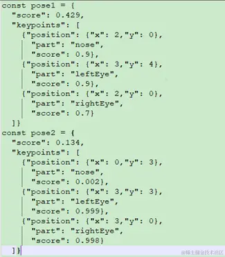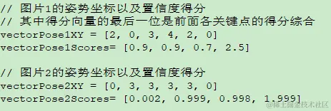 因为有三个关键点,每个关键点包含二维坐标和置信度得分,将坐标位置向量打平就得到了6维向量vectorPose1XY,而置信度得分向量vectorPose1Scores是4维,其中前三维是三个关键点对应的置信度得分,最后一维是关键点打分的总和,比如2.5=0.9+0.9+0.7;