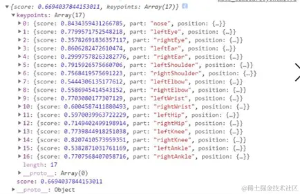 通过上图输出示例可以看出这个姿势的整体置信度 为0.6694,这个姿势包含17个关键点,每个关键点会有对应的名称、二维坐标位置以及关键点对应的置信度得分。比如第一个关键点是鼻子(nose),对应的置信度得分是0.8434,并且还会返回鼻子对应的二维坐标。
