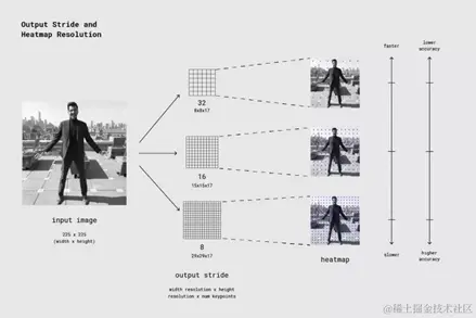 - 输出步幅:输出步幅会影响神经网络中层的高度和宽度。输出步幅越低,模型的准确率就会越高,但是相对的线上识别速度就会越慢。通俗的理解其实有点像图片的分辨率问题,步幅越低,图片的分辨率就越高,分辨率越高可以认为是图片更高清了,那么模型的识别准确度就会越高,对应的模型的识别速度就降低了。下面是同样一张照片使用不同步幅对模型准确率和识别速度的对比图:
