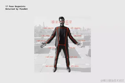 基于PoseNet算法识别人体姿势通俗的理解就是输入一张图片,模型会返回图片中人的姿势。这里姿势主要包括17个关键点。需要说明的是因为模型主要目标是识别图片中人的姿势,也就是人身体的关键位置点,所以并不会关注图中的人是谁,也就是说不会进行人脸识别(好处在于可以保护人的隐私)。PoseNet算法会识别出人的姿态,具体如何刻画这个姿态主要是通过人的17个关键部位,每个部位会得到一个检测结果的信任值,信任值范围在0-1之间,1代表检测结果的信任值是最高的。下面是PoseNet算法可以检测的17个关键点图: