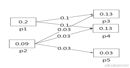 上图中总共有五个网页p1-p5。假如p1的得分为0.2,因为p1有两个下游链接网页p3和p4,那么会将0.2平均分到p3和p4;P2的得分为0.09,对应三个下游链接网页p3、p4、p5,那么综合计算下来p3和p4的得分就是0.1+0.03=0.13,p5的得分仅为0.03。网页链接的得分最终取决于链接的数量和质量,上游的网页链接数量越多,质量越高(这里指得分)那么该网页链接就是相对中心的网络点,重要性越高。