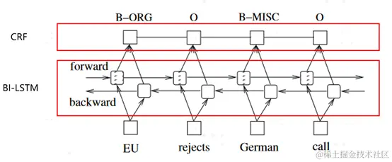 LSTM+CRF模型是2015年在论文《BidirectionalLSTM-CRF Models for Sequence Tagging》中被提出来的,模型结构如下图所示: