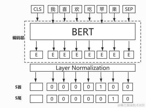 除了基于BERT+CRF提取关键词,苏神还分享了一种基于BERT+半指针半标注模型用于提取关键词,因为之前写过一篇文章《广告行业中那些趣事系列17:实战基于BERT和指针网络的实体抽取》,里面有详细的源码讲解,整体效果还不错,这里不再赘述,下面是模型结构图: