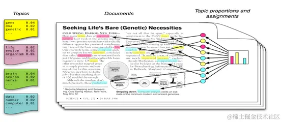 上图中左边部分是文档的主题分布概率,其中头部主要包括“genetics”、“evolution”、“disease”和“computers”四个主题,每个主题会对应一定的关键词。通过这种基于主题概率分布的方法,LDA模型有以下优点:首先,可以获得文本语义相似的关系,可以一定程度上解决多义词的问题;然后,LDA还可以去除文档中噪音的影响;其次,LDA是一种无监督的方法,可以完全自动化,不需要人工标注数据集,可以直接通过模型得到概率分布;最后,LDA和语言无关,模型的应用范围更广。