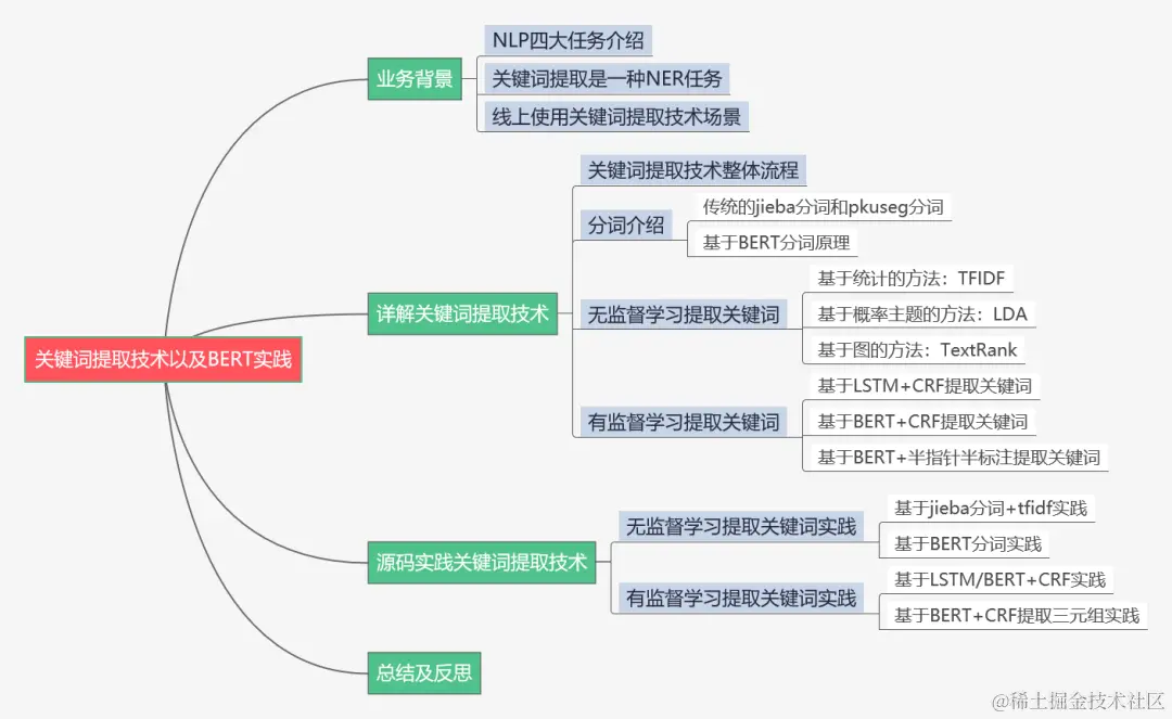 本篇从理论到实际介绍了NLP领域常见的关键词提取技术。首先介绍了业务背景,包括NLP四大任务介绍、关键词提取是一种NER任务、线上使用关键词提取技术场景;然后重点详解了关键词提取技术,包括关键词提取技术整体流程、分词介绍、无监督学习提取关键词、有监督学习提取关键词;最后分别从无监督学习和有监督学习源码实践了关键词提取技术。对关键词提取技术感兴趣并希望应用到实际项目中的小伙伴能有所帮助。
