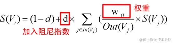TextRank算法的思想虽然来源于PageRank,但也有不同之处:PageRank是有向无权图,而TextRank是有权图,这里权重是两个句子间的相似性。下面是TextRank计算公式: