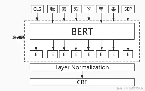 后来BERT横空出世,因为BERT超强的编码能力所以后面主要用BERT+CRF来解决序列标注任务,模型结构主要是将LSTM换成了BERT,下面是模型结构图: