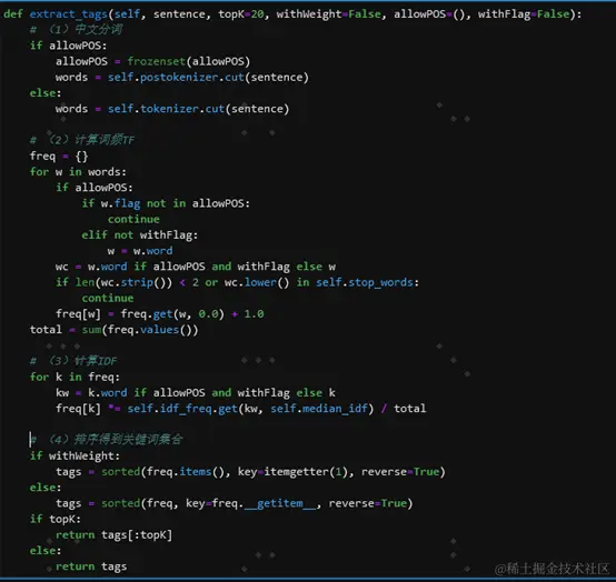 extract_tags函数主要完成了四个工作,分别是中文分词、计算词频TF、计算IDF和最终得到TFIDF算法排序之后的关键词集合。