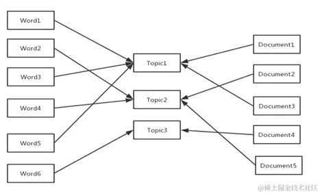 上面说到TFIDF这种基于统计的方法缺点是无法反应词语的语义信息,针对这个问题主要有基于概率主题的方法。基于概率主题的方法是语义挖掘的核心,主题模型认为文档是有很多主题组成的,文档既是主题的分布也是关键词的分布。常见的基于概率主题的方法主要由LSA、LDA(潜在狄利克雷分布)算法等。下面是主题模型映射示意图: