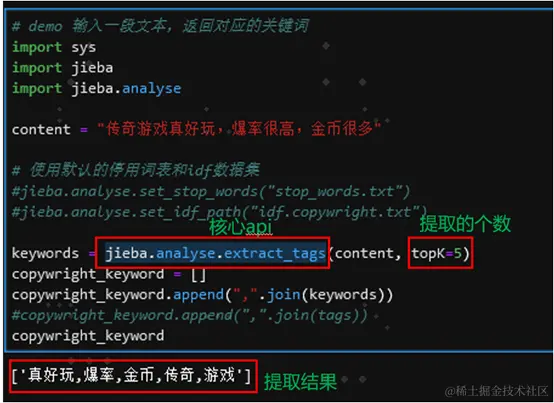 上图中需要注意的是设置提取个数topK=5,那么最终的提取结果就只包含五个关键词,整体来看提取结果还是不错的。这里需要注意的是可以根据自身业务需要调整停用词表和idf逆文档频率文件中关键词的idf值。下面是核心接口extract_tags函数的源码: