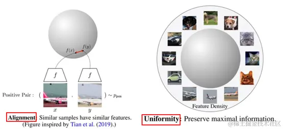 因为对比学习的目标是获得一个优质的语义表示学习空间,在这个空间中相似的样本尽量拉近,不相似样本尽量拉远,那么如何评估这个空间是否优质?文献2中提出了两个评估对比学习模型优劣的指标:alignment和uniformity。下面是两个指标的可视化视图:\