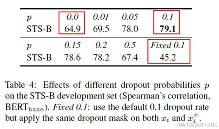 从上图可以看出,作者对比了从0到0.5不同随机采样比例下模型效果,其中效果最好的是使用0.1的随机采样比例。除此之外图中还有两种特殊指标:p=0和固定0.1时模型效果指标较差。p=0时相当于取消了随机dropout mask,固定0.1相当于对样本进行一样的随机dropout mask,这两种操作都会让得到的模型效果变差,主要原因是两者得到的相似样本对一模一样,模型很难学到知识。\