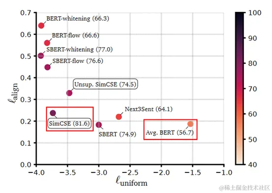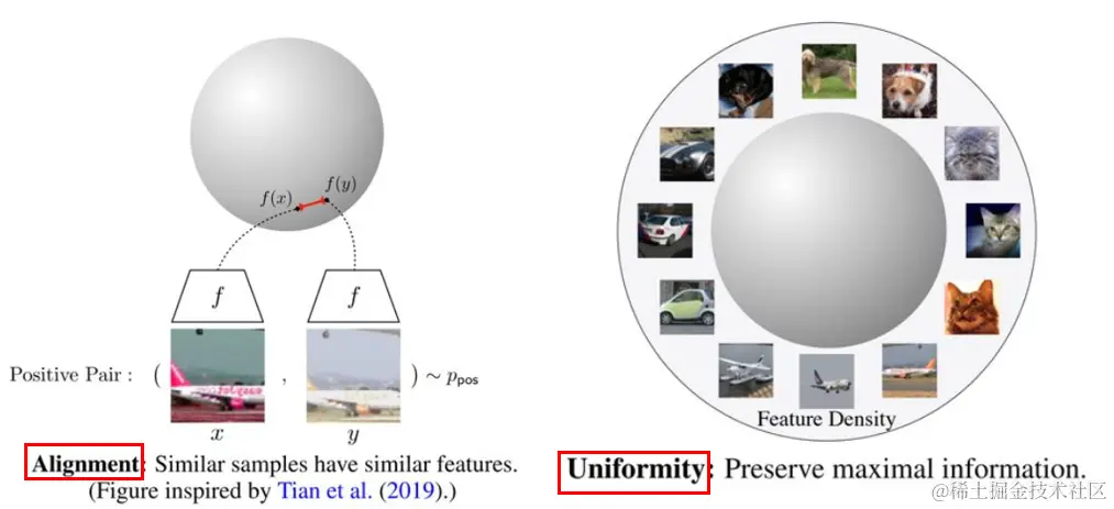 上图中左边部分是alignment指标,这个指标希望在向量空间中两个相似的向量距离应该尽可能拉近,很好理解,基本就是对比学习的指导原则。右边部分是uniformity指标,这个指标希望样本应该均匀的分布在向量空间中,主要原因是样本分布越均匀信息熵越高。举一个通俗的例子,现在有个动物园,我们希望动物园里面各类动物能尽量聚集在一起,同时我们还希望能更好的利用动物园,也就是让动物们均匀的分布在动物园里,让空间更好的被利用。\