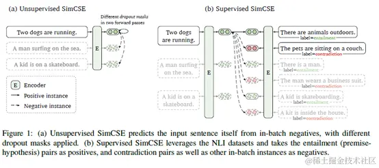 SimCSE模型提供了有监督和无监督两种语义相似度模型,下面是模型结构图: