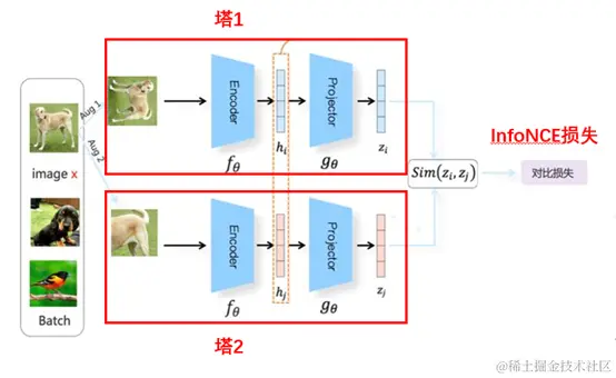 SimCLR模型最早是应用在图像领域中的基于负例的对比学习模型,通过图像样本增强技术来构造正负例,然后基于双塔模型的思想构造标准对称模型,将图像样本经过encode之后再经过projector拿到最终的特征向量zi。最后通过InfoNCE损失函数来使模型让相似的样本距离尽可能接近,不相似的样本尽可能远离。\