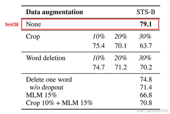 上图中None是SimCSE模型的效果指标,Crop k%表示随机减掉百分比k长度的span,Word deletion表示随机减掉百分比的词,Delete one word表示随机减掉一个词,MLM 15%表示BERT模型随机替换掉15%的词等等。通过对比这些眼花缭乱的样本增强技术,最后证明SimCSE这种随机采样dropout mask的效果是最好的。