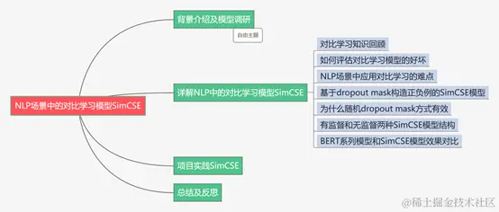 本篇从理论到实践介绍了NLP场景下常用的对比学习模型SimCSE。首先介绍了业务背景,经过一系列调研NLP场景中简单有效的对比学习模型是SimCSE;然后重点介绍了SimCSE模型,包括评估对比学习模型的两个指标alignment和uniformity、NLP场景中使用对比学习模型的难点、SimCSE提出了一种基于dropout mask的方法来构造正负例、dropout mask方式有效性原因分析、有监督和无监督的SimCSE模型以及BERT系列模型和SimCSE模型效果对比;最后项目实践了SimCSE模型。对于希望将对比学习模型SimCSE应用到NLP场景的小伙伴可能有所帮助。\